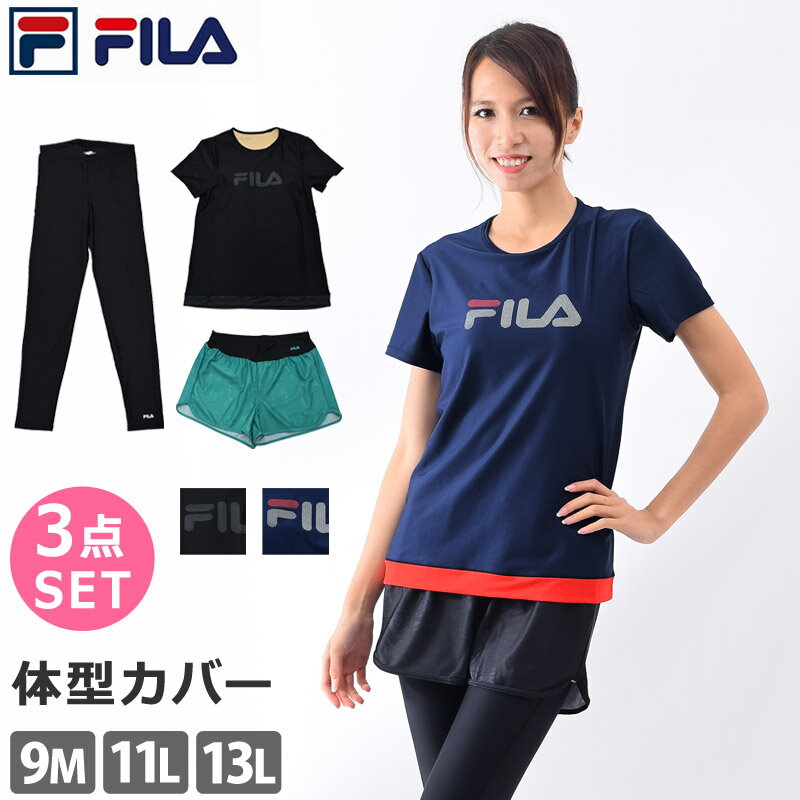 FILA(フィラ) 大きいサイズ セパレート 水着 3点セット レギンス付き ロゴ柄 フィットネス 水着 体型カバースポーツウェア 水陸両用 レディース [女性用] ヨガ ウェア 水着 ホットヨガ サップヨガ ショートパンツ付き ママ 水着 310231-0 15LL/17LL/19LL【送料無料】